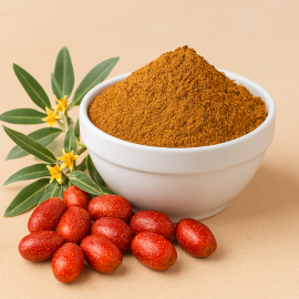 آرد سنجد کامل: درخت سنجد گاهی بزرگ و گاهی بهصورت درختچهای كوچک ديده مىشود و داراى برگهای بيضىشكل و نيزهاى است. رنگ پشت و روى برگها نقرهاى است و حالتی گرد آلود دارد. گلهای سنجد، كوچک و زردرنگ و بسیار معطر است. ميوه سنجد به شكل و اندازه زيتون و گوشت دار است و دارای پوست نازکی به رنگ قرمز نارنجى و گوشت آن سفيد نخودى و دارای طعمى اندک شيري..